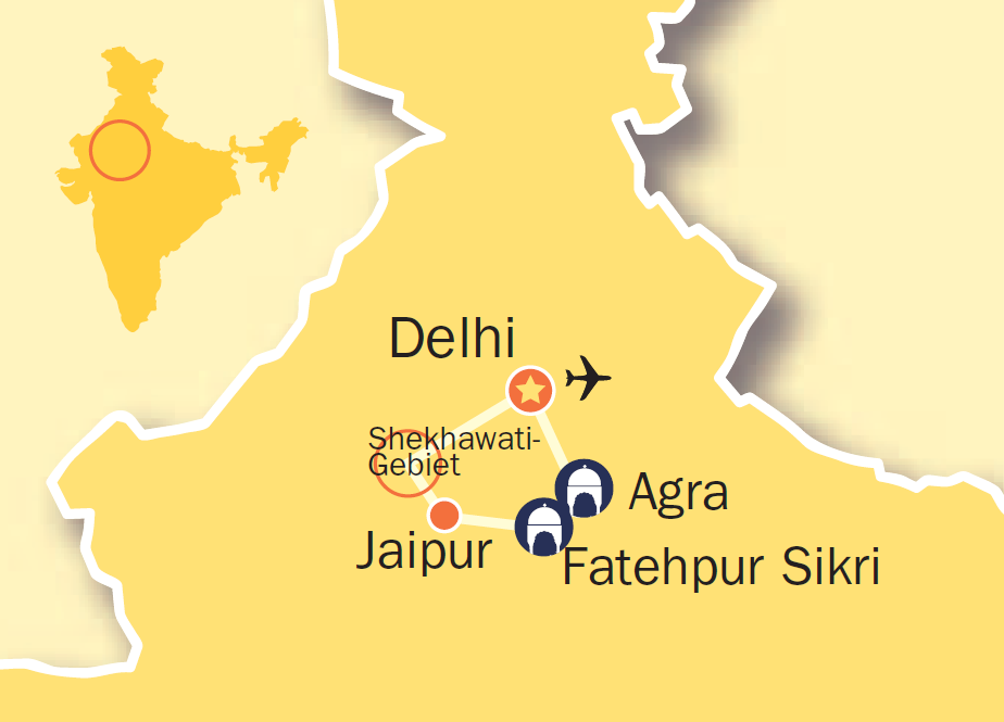 Delhi, Agra mit Taj Mahal, Fatehpur Sikri, Jaipur mit dem Palast der Winde, Shekawati-Gebiet.