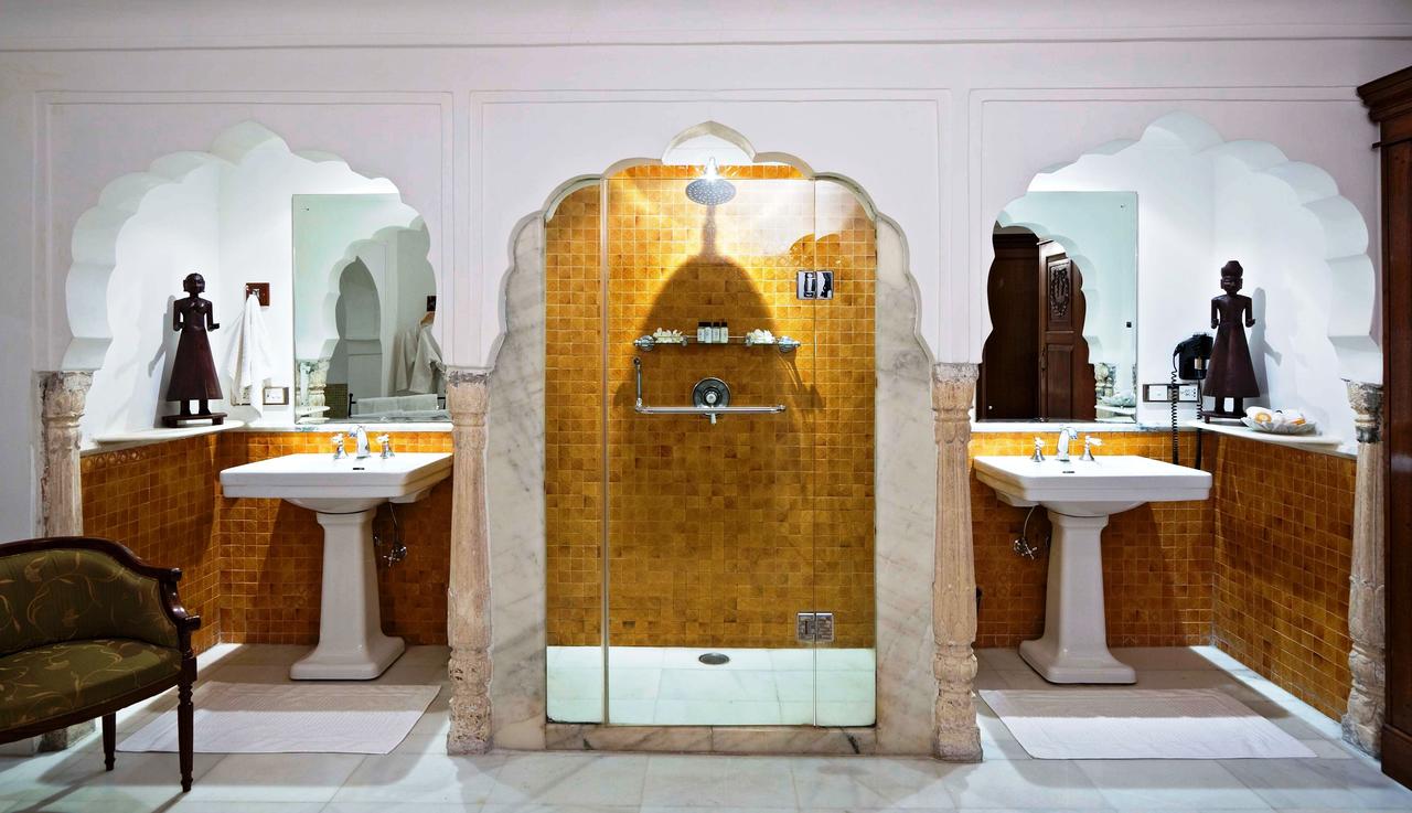 Alle Suiten haben Kingsize-Betten, private Terrassen, gewölbte Decken und riesige Badewannen, die aus einer einzigen Platte aus grünem Udaipur-Marmor geschnitzt sind.